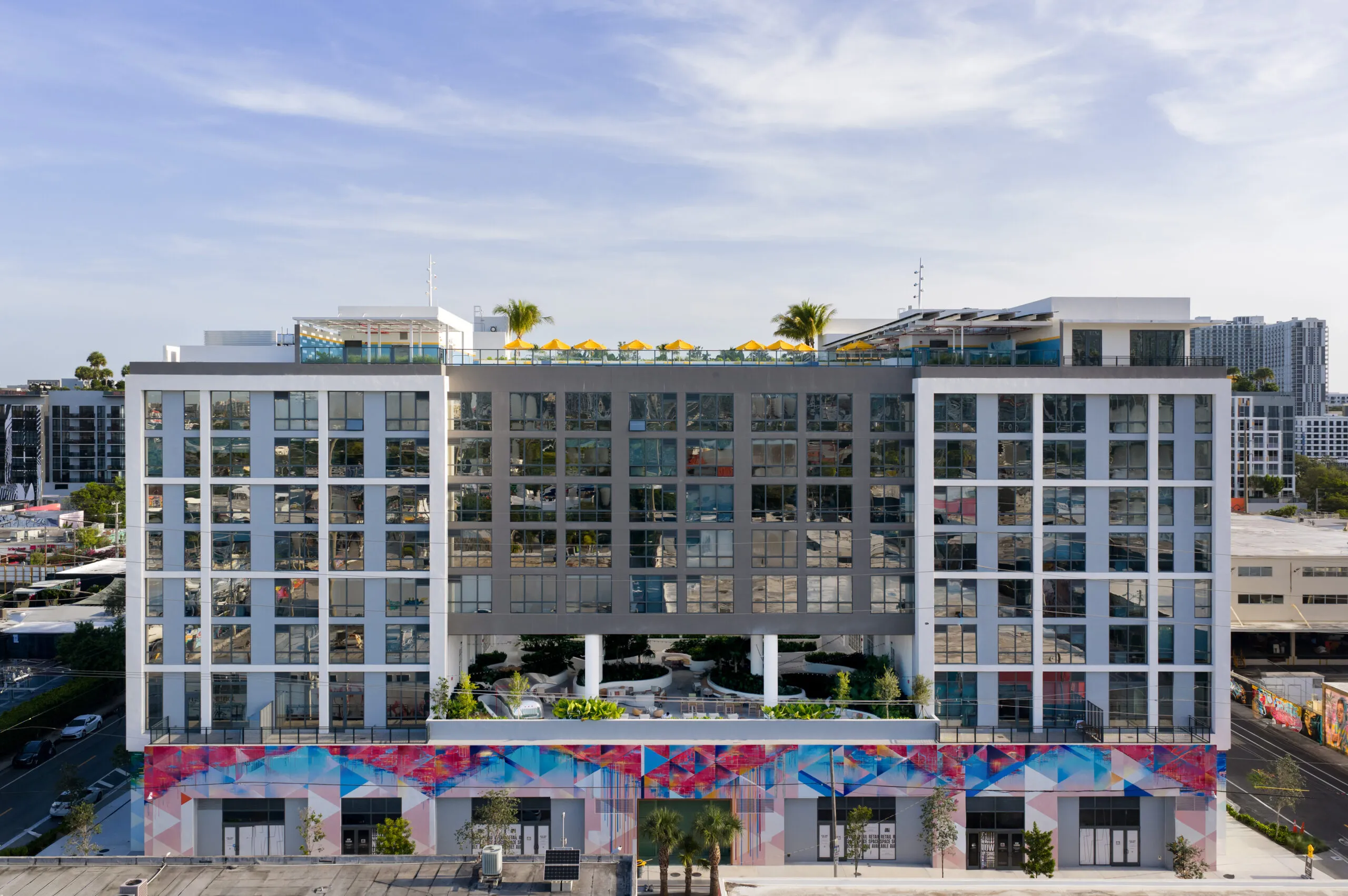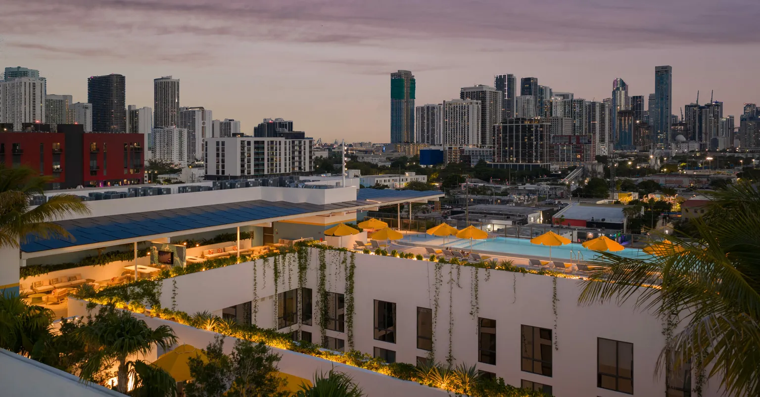 Exclusively for residents, the second floor hosts a multi-story courtyard oriented toward NW 22nd Street, connecting all amenity spaces. Planters with integrated seating create a tranquil sanctuary, while the rooftop pool deck on the ninth floor offers stunning views of the vibrant surrounding neighborhood.